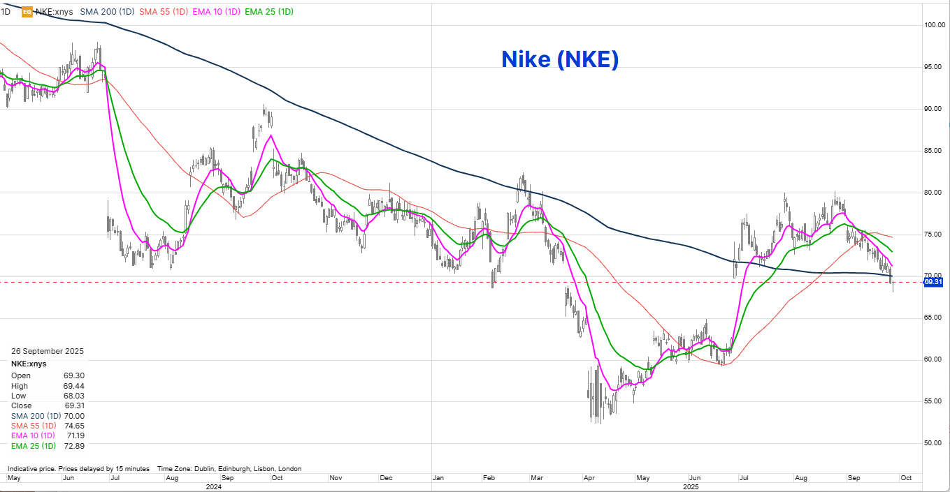 Nike is the largest company reporting earnings this week - tomorrow after the market close. The company suffered an ugly markdown of its share price on a struggling business model under its prior CEO (replaced late last year) that pivoted excessively on a direct-to-consumer model, relying far less on third party wholesalers and retailers. Nike was also hit hard early this year by the US tariffs, as its production is in China and Southeast Asia. The last earnings report in late June engineered a huge jump in the share price as the CEO suggested the worst is behind for the company. A big test in the market’s confidence on this earnings report tomorrow. I somehow doubt that these shoes are contributing to the Nike’s near-term prospects, although I am the last person to notice what is in style. As well, Nike is collaborating with Kim Kardashian on a line of “activewear” products for women that launched last week - there could be guidance on the level of interest there. Technically, the stock just edged below the 200-day moving average, having not come anywhere near closing the gap since the prior quarter’s earnings.