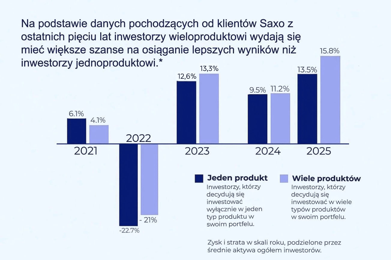 Z analizy zagregowanych danych dotyczących aktywności klientów Saxo z ostatnich pięciu lat wynika, że osoby korzystające z więcej niż jednego typu produktu częściej osiągały wyższe stopy zwrotu niż klienci ograniczający się do jednego typu produktu (np. wyłącznie akcji)
